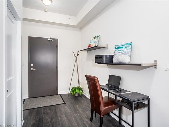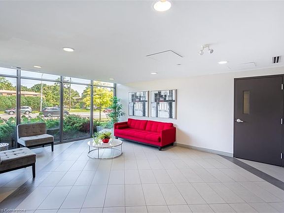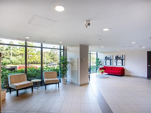 Enjoy carefree living in Mod'rn! A smaller boutique condo providing a quieter, less congested setting than many larger condo complexes. Relish in the convenience and privacy of this unique ground-floor end unit, tucked away in a quiet C-shaped building. With only one neighbouring unit beside you and no one below, you'll experience an enhanced level of peace and quiet. This prime unit location offers quick and easy access to the underground parking stairwell making commutes a breeze, while large 9' windows overlook a scenic roundabout complete with landscaped flower beds and greenspaces, adding charm to your living space. Enjoy the added security of seeing all arrivals as they pass by while looking out into the building's beautiful interior facade. Entertain friends on the spacious rooftop patio with sweeping south facing views complete with lounge furniture, gas fireplace and gas BBQ's. Party room on the ground floor provides options for indoor events and an alternative setting during the winter months. This carpet free unit provides 10 foot ceilings, & 6 appliances. Kitchen includes movable island, backsplash & granite countertops. The Living room includes a sliding patio door entry to your personal terrace. Only ground floor units such as this one are permitted personal BBQ's on the terrace. All windows in this unit are complete with Panorama Sterling 50 Solar Gard window film for enhanced privacy, UV protection, and energy efficiency. 1 underground parking space is included. The underground garage has ample visitor parking spaces for guests. Conveniently located close to QEW and Burlington Go. A great place to call home. This unit is ideal for anyone seeking ground-level accessibility combined with the benefits of a private end-unit retreat.