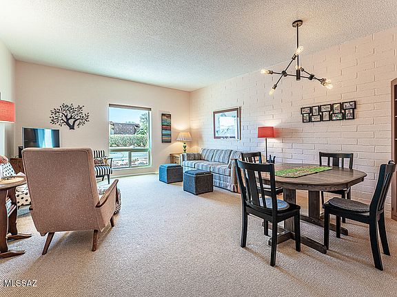 A lovely light-filled townhouse that you can call home full-time or part-time. Fully furnished including kitchen items, linens, etc. (the sellers will keep some smaller personal items). Mostly tile with wool Berber carpet in the living room only. Kitchen has butcher block Formica and black appliances along with a large pantry closet. Some mountain views from the front area and a nice mtn view from the back patio. The patio concrete was painted by a Tubac artist for a beautiful accent. An additional patio cover was installed to offer extra shade. Step outside the gate to an extended patio area to enjoy the wildlife and the mountain view. Trane HVAC installed in 2023 (15 SEER), roof recoated March 2024, Bill's Pest Control contract valid until March 2026.