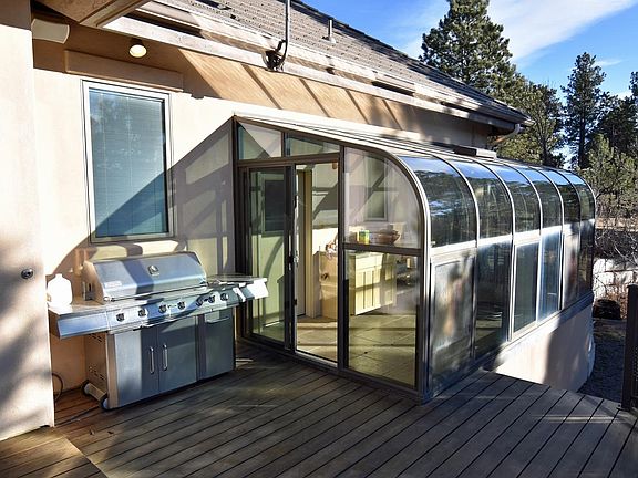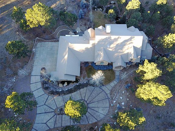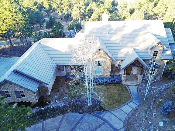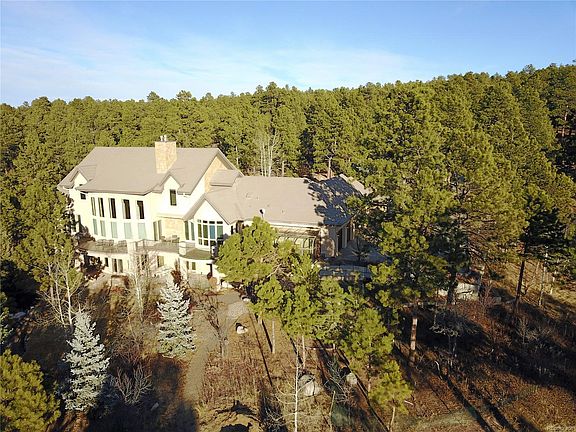 Quality & finishes! 5 wooded acres, mountain views. Commute to Denver or Colorado Springs. French country style combines formal and warmth. Main level master, living and dining rooms, office, kitchen, hearth room, dramatic entry, 4-car garage & greenhouse. 2BR w/baths & loft study up. Basement family room, wet bar, 2BR w/baths, storage, security room. Master suite w/wood floors, fireplace, crown, bath w/stone counters, warm air tub, shower & walk-in closet & access to decks. Paneled main level office w/built-in cabinets, desk & shelves. Gourmet tiled country kitchen with large nook & hearth room with fireplace (both access the deck). Granite counters, farm sink, 2-tone custom cabinetry, built-in bookcases & desk, high-end appliances, wine cooler, icemaker, dishwasher. Adjoining butler's pantry with storage, prep sink & refrigerator. Formal dining room with plank floor and warm beam vaulted ceiling adjoins private covered patio. Walkout basement family room with stone fireplace.