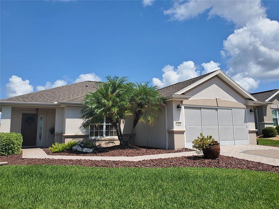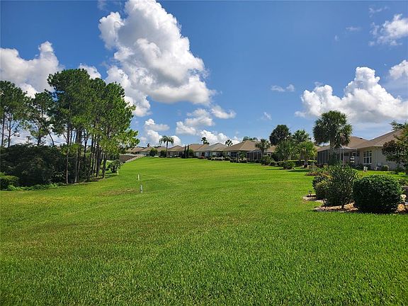 WOW!!! Location, location & the VIEWS are exceptional! First time on the market. This is a one-of-a-kind custom Alydar with 1,608 square feet of living space! Beautifully landscaped with hacienda wall and killer TILED back patio with views of EVERY SUNSET! Built in 2005, this home boasts the original Architectural Shingled roof and HVAC system with HUMIDISTAT; HOWEVER this home has been VERY GENTLY used, yet so loved! There is leaded glass in the front door sidelight, custom ceiling fan, built-in bookcase/tv hutch and laminate floors in the Great Room. The Great Room leads to the Family Room (with beautiful ceramic tile on the diagonal) that is completely glassed from floor to ceiling with gabled roof line from which you can see clear across the golf course to Del Webb Boulevard. This room also features a REIKER remote controlled ceiling fan, with ceiling light and a heater for cooler evenings.... the temperature out there is splendidly comfortable at this time in August. This room has a LIFETIME WARRANTY. You can also see a water feature on the golf course and the home is located on the Heritage/Champion courses. There is more than ample room for an inground pool as well! The kitchen has bisque kitchen cabinets with crown moldings, a brand new garbage disposal, a nicely tiled backsplash, pretty window valances, a full-size kitchen table with 2 add'l leafs and a very handsome light fixture. Oh, did I say this home is COMPLETELY TURNKEY? Both bathrooms are tiled with framed mirrors and there is a water closet in the Master Bathroom, as well as, a shower and the guest bath has a tub/shower combination. The typical Laundry Room in the home has been built into a small office with desk and built in cabinets. The garage is extended 4' and has a very nice laundry area and cabinet with sink. The floor has been painted and all storage cabinets will stay with the home. There are also sliding garage screens and of course a paver driveway, sidewalk and front porch. The exterior of the home was last painted in 2019 and Bowles Roofing did an inspection on the roof last year and said it was in great shape! Owners have paid for a 10 year termite bond on the property. The Master Bedroom bed is King size and the pull out sofa in the 2nd bedroom has a blowup queen mattress. The location on the golf course and the VIEWS, VIEWS, VIEWS will be screaming SERENITY NOW! Make an appointment today!