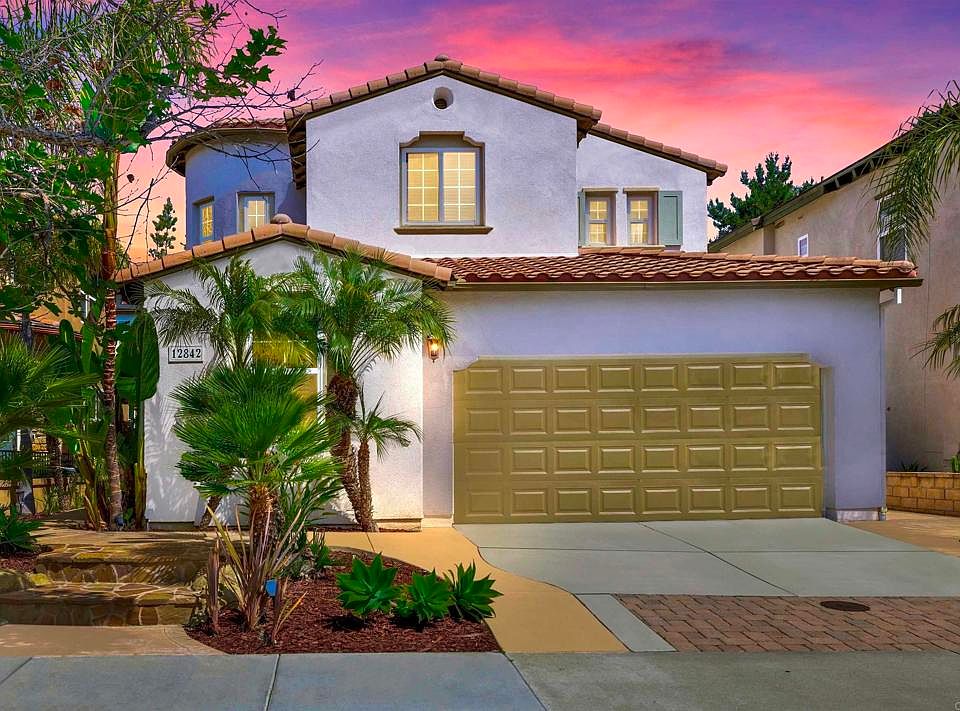 A rare opportunity to live in the tightly-held neighborhood of Pacific Highlands Ranch community. Accessed via a private main entry, the spacious open-plan living boasts high ceilings, travertine tile flooring and large windows offering an abundance of natural light. The open concept kitchen features stainless steel appliances and a large granite island with multiple spaces for seating. The light-filled living area is complete with built-in entertainment unit and a gas fireplace adjacent to the formal living/dining room. Double doors open to an outdoor entertaining space with a low-maintenance terraced-garden design. The first floor includes a bedroom with full bathroom offering the convenience of single-level living, or alternatively a separate home office. Upstairs, the oversized primary suite features a central recessed ceiling and interior plantation shutters. The large en suite consists of a separate tub and shower, dual vanities and walk-in closet. In addition to the large upstairs retreat with built-in entertainment/storage unit there is a sun-filled study or reading nook. The laundry room is located on the second floor, with a utility sink and a linen storage alcove. The property features a 3-car garage and a fully-owned solar electricity system. The home is located within a short distance of Sycamore Ridge Elementary, Cathedral Catholic High School and Canyon Crest Academy. Residents have HOA access to the West Highlands Pacific private recreation center, which includes an olympic-sized pool with spa, family play area, fitness center, recently remodeled club room and numerous outdoor entertaining spaces.