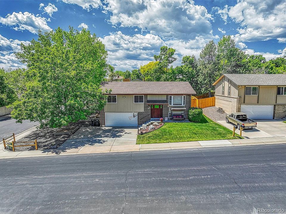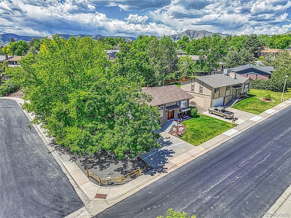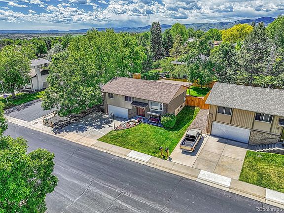 Updated home on huge corner lot in the desirable Green Mountain subdivision of Lakewood. Quiet interior location. House with great curb appeal sits on the edge of a cul-de-sac. Mature trees provide wonderful shade and privacy. Not far from St. Anthony hospital and lightrail/bus depot. Quick access to 3 highways, 1-hour drive to Loveland Ski Area and Continental Divide, and 20-minute trip to downtown Denver. Nearby are Green Mountain trailheads, fenced and gated Forsberg Iron Spring Dog Park, multiple golf courses, Red Rocks Amphitheater, Bear Creek Park, and highly rated schools. Beautiful back yard with large stamped-concrete covered patio. Sprinklers for front and back yards and trees. Wonderful kitchen features luxury vinyl-plank (LVP) flooring, stainless steel appliances, quartz counters, and attractive custom backsplash. 3 bedrooms on the main floor including primary bedroom with its own bathroom and full hall bathroom. Bathrooms have LVP flooring and tiled showers. Large living room with bay window. Big dining space. Ceiling fans in all bedrooms, living room, and dining space. Spacious and bright lower level with gas fireplace. Huge 2-car attached garage with recessed space, plus extra off-street concrete pad parking next to driveway. Additional features: radon mitigation system, class 4 roof, evaporative cooler, whole house fan, new interior doors, double-paned vinyl windows, newer fence, updated light fixtures, steel front door with glass accent windows, and lower-level utility sink.