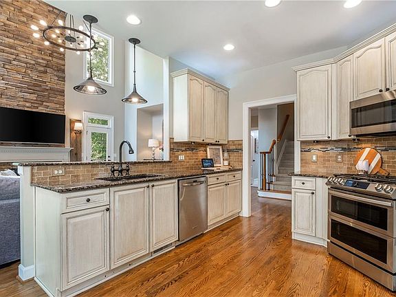 - Features: Breakfast Bar, Breakfast Room, Cabinets White, Eat-in Kitchen, Pantry, Stone Counters, View to Family Room