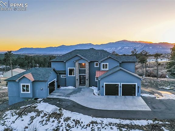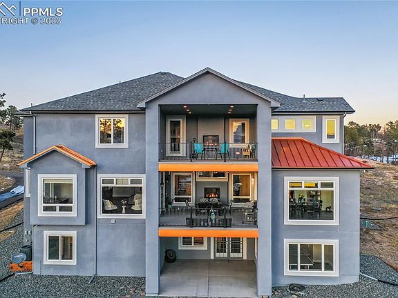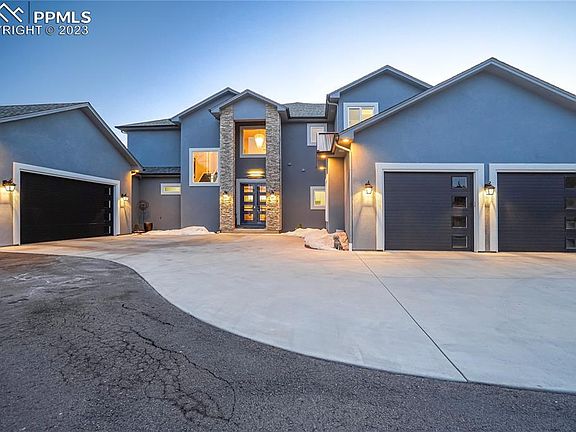 Custom Designed Magnificent Luxury Residence Built in 2017 w/ Modern Flair and Over 7,200 Sq Ft on 5 Acres in an Unparalleled Location in Sought After Western Black Forest! Tremendous views of Pikes Peak, full mountain range, Air Force Academy, the treed hills and the evening city lights! The best of both worlds living on beautiful close-in acreage at the edge of the city w/ convenient access to everything you need. Two expansive primary suites - one on the main level & one on the upper level. Both primary suites feature walk-in closet, walk-out to deck, sitting area, standalone tub, double vanities, spa showers w/ rain shower heads, handheld sprayers, massagers. All six bedrooms are ensuite. The home has two laundry rooms, 4 fireplaces, 7 baths, 4 car attached garage, hand texture throughout, slab stone counters throughout, glass railings, smart home features, main and upper level baths have heated floors. Open concept kitchen w/ high end cabinetry, JennAir and Bosche appliances, induction cook-top, slab stone counters, double oven, lighted glass front cabinets, walk-in pantry. Great room w/ walk-out to composite deck, two way gas fireplace. Finished walk-out lower level w/ large family room, wet bar, 2 additional bedrooms and baths. Amazing outdoor entertaining spaces all with spectacular views, lighting and glass railings. Main level deck, upper level private deck and lower level patio. Only minutes from Flying Horse featuring an 18-hole Tom Weiskopf Signature Golf Course, high end steak house, athletic club and spa. Two minutes from Black Forest Regional Park w/ 385 acres open space, miles of trails, playground, picnic tables and tennis courts. Quick access to Highway 83 and I-25 and all the amenities of Northgate. Quick access to Colorado Springs or Denver. Award winning School District 20. Outbuildings are allowed. RV parking. All paved roads. Too many custom features to list - see this home quickly! Matterport 360 Interactive Floor Plan Available.