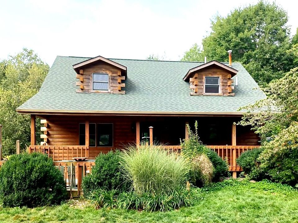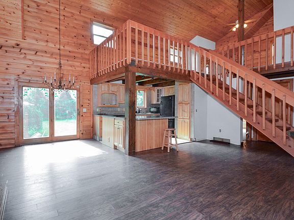 4 acres with Fruit Trees, Magnolia Tree, and open floor plan 1,404 sq. ft. Log Home, features Great Room, Kitchen, Dining Area and Primary Bedroom, Full Bath and Main Floor Laundry. Upper Loft Area could be Second Bedroom with Full Bath. Garage has Mother-in-Law apartment above with Living Room, Kitchen, Bedroom and full Bath. Home has been freshly painted with new carpeting throughout. Estate Property sold ''as is''. *Two outside blue buildings are privately owned by family member and will be removed from property at close. Do not enter. *Total square footage includes apartment above garage.
