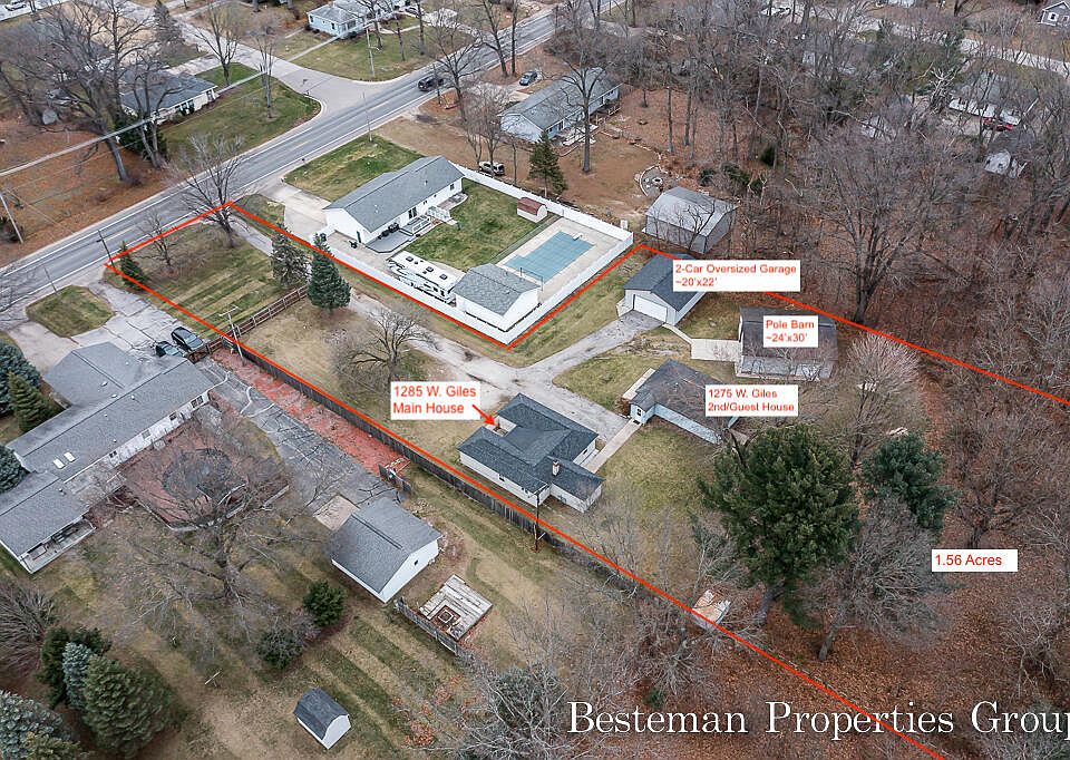 Rare find in Reeths-Puffer School District! TWO ready-to-move-in houses, oversized 2-car garage, & pole barn on a fantastic 1.56 acre lot! The main house (1285 W. Giles) features a no-step entrance, new carpeting, 3 bedrooms, large living room, dining room, large kitchen with appliances, laundry/mud room, & 1248 sq ft. The guest/2nd house (1275) features new luxury vinyl plank flooring throughout, a full kitchen with appliances, dining area, laundry area, front mud room entrance, large living room with slider to the beautiful back wooded area, 1 large bedroom, & 768 sq ft. The 2-car oversized garage is approximately 22'x27' & the the pole barn with electric & compressed air lines is 24'x30' with two doors (one for your camper or boat & the other for a riding lawn mower). Call today!