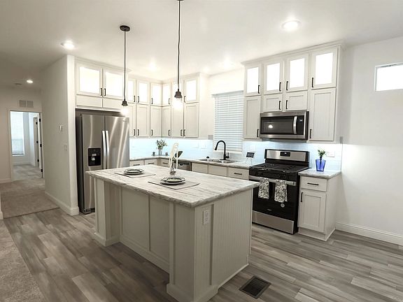 Adorably charming white house w/light blue trim, and the perfect porch to relax on in this 55/18 park. *The 1st person must be 55+, anyone thereafter must be 18+. The Calming interior color scheme is accompanied w/white shaker cabinets, top cabinets are glass w/illumination and under cabinet LED countertop lights. Hardware throughout home is black. All stainless appliances in kitchen, including side-by-side refrigerator w/ice-water dispenser, sink, dishwasher, built-in microwave. Range is black w/stainless trim. Pull-down kitchen faucet. Soothing, sky blue, full wall subway tile backsplash in kitchen. Same tile in both bathrooms. Recessed lighting in kitchen and central island w/pendant lighting. Rounded corners throughout and 9' ceilings. Upgraded lever handles throughout, upgraded windows, pocket door to laundry room. Step-in tiled shower in master w/mosaic ribbon, his/hers sinks and framed wood vanity mirror. Guest bath has shower/tub combo. Matching shed. Central A/C. Back and side yard for gardening, pets, etc... Welcome home!