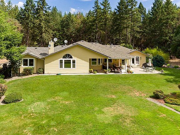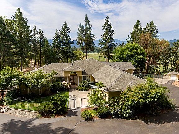 Applegate Valley! Set on 8.10 acres, this contemporary, 3325 square foot, single level home is a private retreat with a perfect blend of open space, trees and views! The comfortable floor plan features a welcoming front courtyard and entry, Living room with fireplace, spacious Dining room, well-appointed Kitchen with fine appliances, pantry, granite countertops and breakfast nook. A wall of windows allows you to enjoy picturesque views of the valley farmland, mountains and sunsets from the large family room and outside covered patio. Four bedrooms, 3 baths include a Master Suite with French doors to the patio, walk in closet and bathroom with double sinks and shower, a separate 2nd Master suite with door to a private deck, and spa-like bathroom with shower and sauna. Three car garage, RV parking, gated, paved circle driveway. There is an 864 square foot shop with plumbing, HVAC and double garage door. You will enjoy living and entertaining here and being just minutes to wineries, the Applegate River, historic Jacksonville, Medford or Grants Pass.