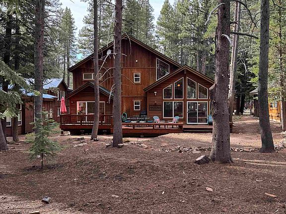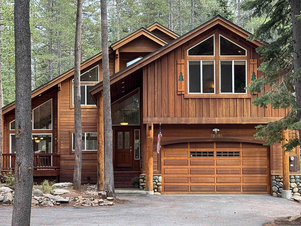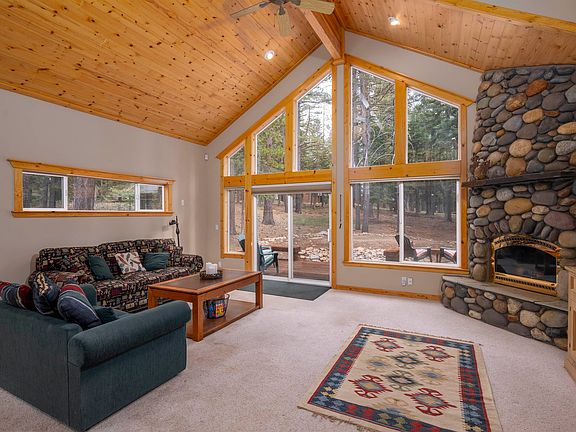 Popular and spacious design in Tahoe Donner! Tucked away on a quiet street, this home sits on a level .42-acre lot with a serene setting and offers over 2,700 sq. ft. of inviting living space. Inside, soaring wood ceilings and expansive windows fill the open layout with natural light. The main level features a generous kitchen with stone countertops that opens to the dining and living areas overlooking the natural landscape, a convenient half bath for guests, and a large primary suite with direct deck access and a tiled bathroom with double vanity, jetted tub, and walk-in shower. Upstairs, you’ll find two additional bedrooms, another full bathroom, a spacious loft, and a large bonus room or fourth bedroom complete with its own bathroom, walk-in closet, and wet bar. This versatile space works well for guests, extra sleeping, entertaining, or cozy movie nights. Step outside to enjoy front and rear decks that are perfect for grilling, gathering, or simply relaxing. Additional highlights include two dramatic floor-to-ceiling stone fireplaces, a sauna, laundry room, airlock entry, attached two-car garage and a new refrigerator. A truly fantastic Tahoe Donner home designed for both comfort and function, ready to be enjoyed by its next owners.