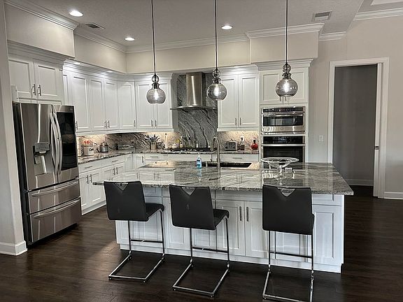 - Interior Features: Ceiling Fans(s), High Ceiling(s), Master Bedroom Downstairs, Split Bedroom, Crown Molding, Walk-In Closet(s), Window Treatments, Solid Surface Counters, Solid Wood Cabinets, Kitchen/Family Room Combo, Built in Features, Tray Ceiling(s), Thermostat