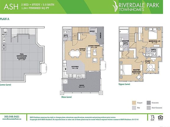 New build in the established, quiet Riverdale Park! Enjoy the maintenance free living, community pool, basketball court, playground, and trails. Walk to shopping and dining. This corner unit offers an open floor plan, featuring two bedrooms, study, three bathrooms and a full unfinished basement with rough-in plumbing and a tank-less water heater. Relax and enjoy the outdoors from the comfort of your patio that includes a seating area and space for a grill. Home includes granite kitchen counter tops with 4" granite backsplash, under mount SS kitchen sink, upgraded cabinets, stainless steel kitchen appliance package with tile flooring. ASH floor plan includes one car detached garage. Pictures are representational only, not of the actual home - upgrades, designer colors, and inclusions will vary per address. Full $4,500 Earnest Money due at time of contract.