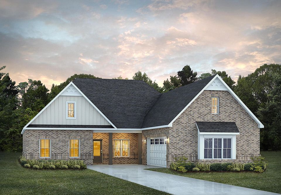 The "Chatsworth II" is a Ranch-style house with 2nd floor bonus room that is sure to please. This 4 bedroom 4 bath plan starts with the refined foyer entry way that joins to the formal dining room rich with hardwood flooring. Next, experience the open kitchen with large center island and adjoining breakfast room. The kitchen offers built in appliances, granite countertops and walk in pantry. The large great room area is complete with a natural gas fireplace and opens out to a covered porch area that is great for relaxing after a long day. The master quarters provides a large bedroom and bathroom area with double granite vanities, garden/soaking tub, tiled shower with glass door and spacious walk in closet. The 2nd floor features a large bonus room with a full bath & closet. This plan will not disappoint!
