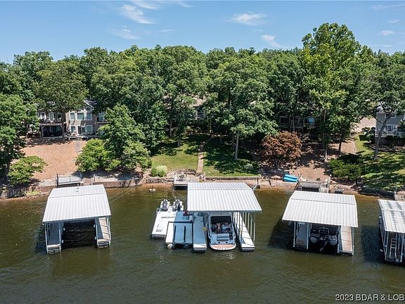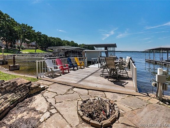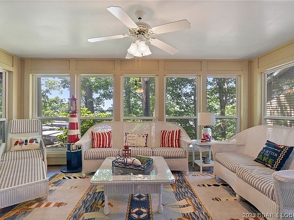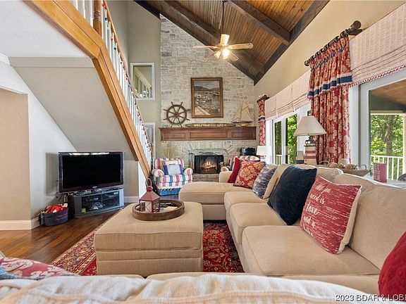 Some homes put off a "good vibe" or have a certain aura. This beautiful Nantucket inspired home is one of those that feels comfortable, inviting, & guest friendly. With 7 brs, 6 baths & plenty of living space, you will certainly have room for family/guests. Nice circle driveway with stone pavers offers plenty of parking for the biggest of gatherings! You will be impressed with the pretty front door/entry foyer with beautiful wood floors and wood lined barrel ceiling that leads you to the homes most prominent feature, THE VIEW! Simply amazing with sunsets galore over up the Gravois Arm. The covered porch is huge and a great place to relax before or after boating. In addition to the porch is the lakeside Martini deck leading out to the 2 well boat dock with boat/pwc hoists. Home is fun & unique, lots of cozy spaces & comfortable gathering areas. Four Seasons amenities including pool, tennis court, pickleball, basketball, & playground are within walking distance. Home is fully furnished!
