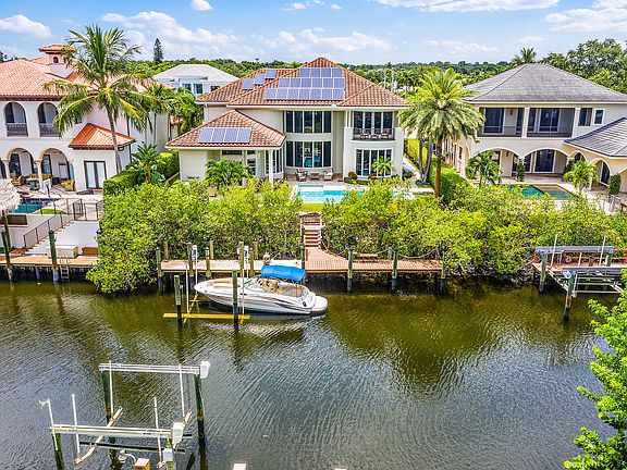 Stunning Custom Home - Bring your boat - easy access to Intracoastal and Ocean, no fixed bridges. First floor office/Den, master suite with his/hers bathrooms/walk-in closets and exercise room. Two ensuite bedrooms, plus 4th bedroom and loft upstairs. All impact windows, beautiful marble floors downstairs, full smart home, heated salt water pool w/spa and complete home solar panels (last months power bill was less than $20) . Summer kitchen includes Australian style stainless steel cabinets, Lynx built in gas grill, cocktail station and sub-zero outdoor fridge. No HOA fees, lushly landscaped. Immaculately maintained, move in ready.