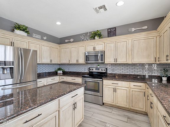 Welcome to this pristine Litchfield Park home ready to make it your own! This home boasts pride of ownership inside & out and it shows!! This spacious 5 bedroom, 3 bath home has been beautifully remodeled in 2021, with tile throughout, 5'' baseboards, inviting color scheme, inviting kitchen with stainless steel appliances & beautiful backsplash. The exterior was also painted in 2022, The 3 car garage is has an epoxy finished floor & is climate controlled with its own A/C unit. There is plenty of parking space behind the RV gate w/ a nice finished concrete slab for your toys/ trailers or a basketball hoop. The low maintenance landscape was complete in 2022. Lastly, the sparkling pools surface was refinished in 2024.