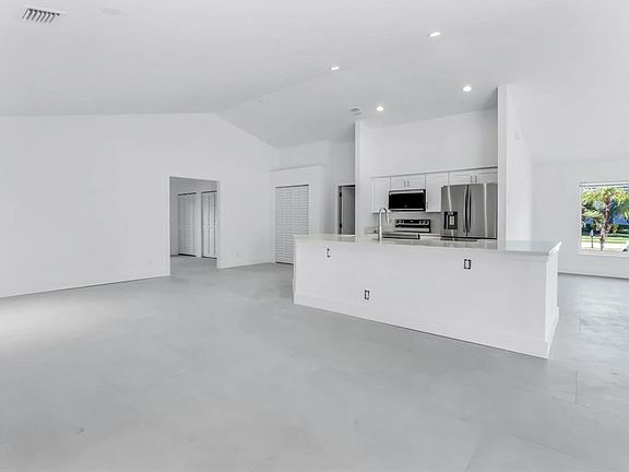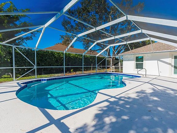 Discover this beautifully remodeled 6-bedroom, 3-bath single-family home offering the perfect blend of space, comfort, and style. Vaulted ceilings create a bright, airy atmosphere in the main living areas, while the desirable triple-split floor plan provides outstanding privacy and flexibility, including space for a potential 7th bedroom or home office. Enjoy sleek 36" x 36" porcelain tile throughout, all-new impact windows and doors, and a modern kitchen featuring stainless steel appliances and a stunning quartzite island ideal for entertaining. Gather in the formal dining room or relax by the newly refinished freeform pool within a screened enclosure. Additional highlights include a new A/C, large laundry room, 2-car garage, and a corner lot with no HOA. A true standout home.