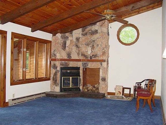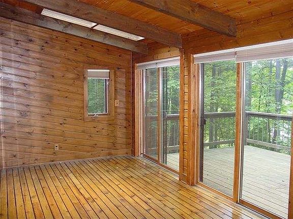 Pretty little Sharon Lake log home. This 1,700 sq ft 3 bed, 2 bath home with its very unique floor plan, features hardwood floors, vaulted and beamed ceilings, yr round sun room, sky lights, fireplaces and more! You will not find another home with this much to offer anywhere near this price! Main level kitchen, living room and lakeside porch with deck. Lower level has 2 bedrooms, family room sitting room lakeside, bath and large storage. Attached 2 car garage and a beautiful setting make this one hard to beat! Priced under FMV!! $199,000.00