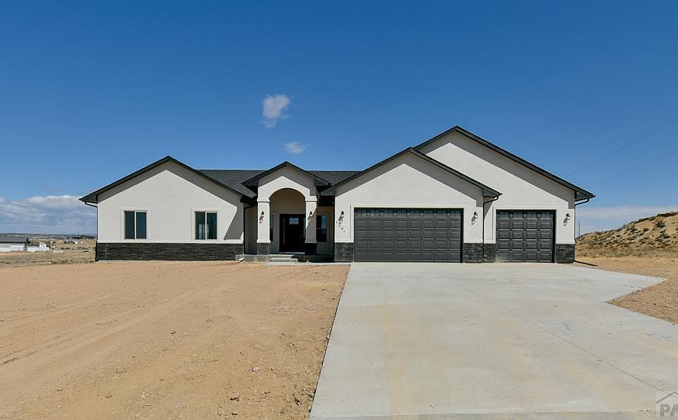 Beautiful new home in a convenient location on the North side of Pueblo West! Stacked stone accents the front columns and entryway of this home and highlights the curb appeal of the home - all complete with windowed garage doors! Open the door into an inviting open floor plan with vaulted ceilings and wood floors. Kitchen comes complete with soft-close drawers, cabinets, granite countertops, tile backsplash, large counter-height island, walk-in pantry and all stainless steel appliances. Private master suite complete with 5 piece bath including soaking tub and large walk-in tile shower. 2 more spacious bedrooms on the main level with a full bath! Large covered patio to enjoy the Beautiful Mountain Views... All this on 1.5 acres in the top of the cul-de-sac!!! Home also comes complete with upgraded septic system to accommodate future bedrooms in the basement. Come see the NEW, larger floor plan with NEW contemporary farmhouse colors! Will be ready last part of April...