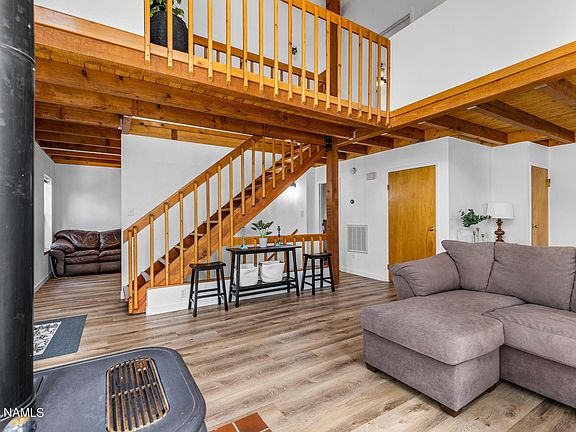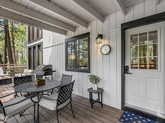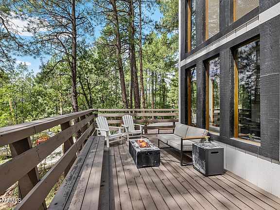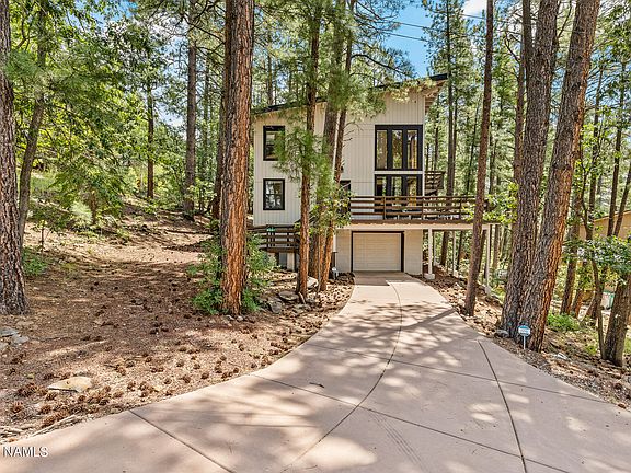 This beautifully remodeled, home is nestled in one of Munds Park's most sought-after neighborhoods, where scenic lake views greet you on your drive. This multi-level residence features expansive windows offering tree-top views from most windows. As you enter the main level, you will find a bright, living room, wood burning stove, and a charming bar. The open concept kitchen and great room create an ideal space for entertaining, centered around another wood burning stove.This area opens up to a spacious, partially covered deck with plenty of seating and stunning views. This level includes a bedroom, bathroom and a bonus room currently used as an office. Upstairs, you will find beautiful wood floors, two bedrooms, a bathroom and a another bonus room that can be used as a sleeping space. The bonus room opens to a second deck, another peaceful sitting area with amazing views. On the lower level behind the garage you will find lots of storage space, including closets and a workshop. Additionally, there is a large game room great for spending family fun time! The home is well equipped for winter conditions, featuring its own generator to ensure reliable power during snow and winter outages. Many improvements have been made to this home, new lower level flooring, new interior & exterior paint, all new lighting, updated kitchen, bathrooms, new garage door, and much more. This home is truly a must see!