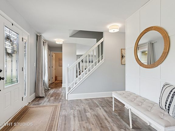 This stunning home has undergone a complete transformation with modern updates throughout, 4 bedrooms, 2.1 bathrooms, finished basement with an open floor plan. Beautiful front entrance, black door with sidelights, porch. Stepping into the foyer with board & batten accent wall, uniform vinyl plank flooring throughout the 1st floor, coat closet. Enjoy generous living and dining areas. The kitchen boasts of white cabinets with crown molding, quartz counter tops with Carrera marble tile backsplash, sink overlooking backyard, newer, stainless steel appliances, 4 burner with griddle gas cooktop, built in microwave, refrigerator with water dispenser, pantry closet, island with additional cabinets, open to the family room. The enormous family room can fit a huge couch, a unique recessed area would be great for toys, reading nook, additional seating, desk area, use your imagination, wood burning fireplace. Primary suite is large to fit several dressers, king size bed, walk in closet. Ensuite primary bathroom newly update with stand alone soaking tub, dual sinks and vanities which have several drawers, Carrera marble trim in the walk in shower complete with glass surround, porcelain tile surround, Palladian window for lots of natural light. Three other good sized bedrooms. Updated hall bathroom, tub/shower, white ceramic tile surround. 2nd floor has a huge closet that could be a laundry room or storage and a second linen closet. The basement is finished with a game room that is large enough for a pool table, recreation/exercise area, plus even more additional storage. Step outside to a beautifully landscaped yard with privacy fence, patio with pergola perfect for relaxing, entertaining or enjoying those summer evenings. 2 garden beds will stay to grow your fresh produce. Major updates: '25 basement, landscaping, '24-22 kitchen appliances, '23 carpet, '21 roof, '19 kitchen & baths, '18 fencing, '09 windows, '12 driveway, '05 a/c. Meticulously maintained, this home radiates pride of ownership and shows like a model.