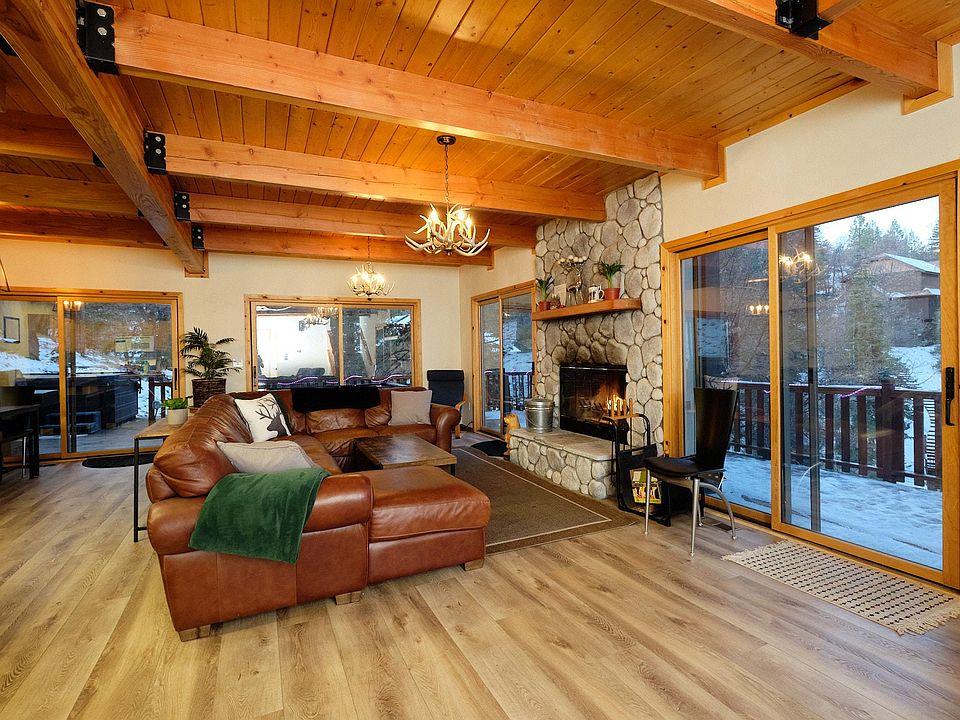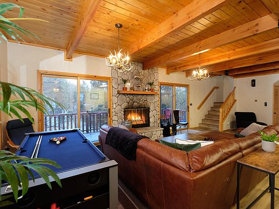 Fully furnished, large, updated 4 bedroom cabin with beautiful views at the end of a cul-de-sac, over 24000 Sq/Ft land backing onto the national forest allows for great privacy. Many amenities including an 8 Person outdoor SPA next to a beautiful fire-pit, big Jetted tub in master bedroom suit, Large wrap around deck with swing, a new LG Laundry tower (washer + dryer), two refrigerators, Miele dishwasher, and new induction range over in the open kitchen. AC in master bedroom and Office, two mounted TV's, pool/game table, Dimable lighting, and much more. Flexible lease terms
