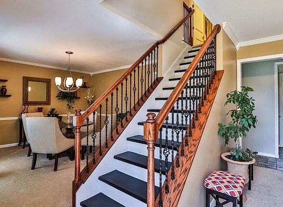 2 story brick on wooded lot in sought after Dougherty Woods, 4 bedrooms with 3.5 baths. Updates galore, including wrought iron/glass front door with side lights, new hardwood entry, fresh paint inside and out. First floor boasts crown molding, updated half bath, family room with wood burning fireplace and sliding door to deck. The eat-in kitchen has a pantry and slider to the patio. Upstairs there are four bedrooms including the master bedroom en-suite which has been updated with newer carpet, a walk-in closet plus an additional closet. The three other bedrooms have hardwood floors. Finished lower level with a rec room, wet bar, full bath and walk-out to patio. Rear entry over-sized attached garage.