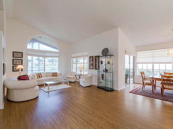Fabulous opportunity with this well cared for home that features a main living area with volume ceilings and fantastic lake views. Vinyl wood look floors run throughout the entire home making it feel updated. You'll enjoy the spacious white eat-in kitchen with center island that has great potential to be opened up. The primary bedroom is large with a volume ceiling and sliders to enjoy the spacious L shaped lanai. The primary bath offers a shower and separate tub as well as extra long dual vanity. There are 2 additional bedrooms, one that is open and being used as a den/office now. The guest bath has been fully updated. Eastpointe's newest feature, The Pointe is set to open June 9 with a huge new gym, restaurant, 2 pools, firepits and more. Eastpointe also has 2 Fazio designed golf courses, pickle ball and tennis! All less than 15 minutes to the airport.