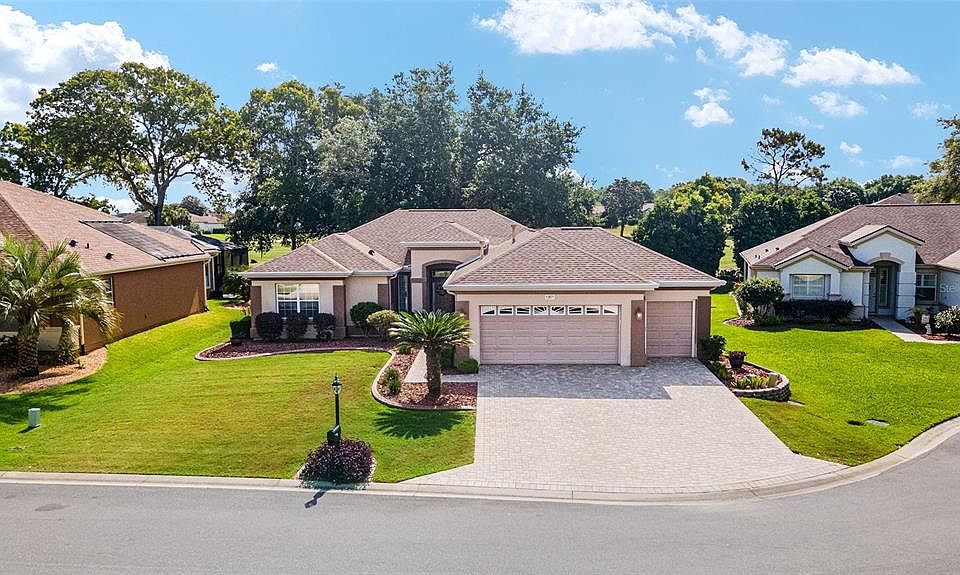 JUST WOW! Are you looking for no backyard neighbors? Check! Maybe you are looking for a home on the golf course? How about a shared irrigation well? Check, Check! … an additional 23 x 17 Flex Room? Check! With the Flex Room under heat and air, the total square footage of this home is 2299. This 2-bedroom, 2-bathroom home with an office/den is in such a GREAT location! Located in Del Webb Spruce Creek Golf & Country Club in Summerfield, it sits in the center of the community, in Torrey Pines! Close to The Horizon Center (clubhouse), the Lake Vista Fitness Center, 3 pools, pickleball & tennis courts and surrounded by four (4) 9-hole golf courses! This home has beautiful landscaping, landscape curbing, and a paver drive, walkway, and front porch. The seller has installed a “hide-a-screen” on both the front door and the golf cart garage door for lovely seasonal breezes. There is a newer roof (2014) and HVAC system. There is a birdcage for your hot tub, grill or just a patio table - if you wish. There is an extended garage AND a tandem golf cart garage! The kitchen boasts a skylight, new SS appliances, and an island and granite countertops. The seller also installed a built-in buffet in the eat-in kitchen complete with a granite top for more storage. The master bedroom is behind double entry doors, has a bump-out window extension and the bathroom has a large bathtub, as well as, a separate, frameless glass shower. The Flex Room is on the southeast side (golf course views) of the home and affords a full wall of windows and is shaded by the lovely backyard trees. The seller is offering a 1 year Home Warranty to boot! Some furniture items and two (2) golf carts are available for purchase separately. Run, don’t walk!….. to see this gorgeous home today! Room Feature: Linen Closet In Bath (Primary Bedroom).