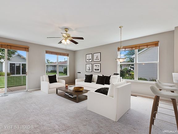 Light and bright Del Web ranch with an open floor plan and a fence for your furry friend! Highlights include; 2 generous size main floor bedrooms, walk in closets, 2 full baths, eat in kitchen with breakfast bar overlooking the great room, first floor laundry, all appliances including washer and dryer, Hunter Douglas wood blinds, large patio for grilling (and fence), front porch, over-sized 2 car garage with built in storage, newer carpet and freshly painted everything at your fingertips! Enjoy all that this active 55+ community has to offer for with the low 127.00 association fee which includes; black topping of your personal driveway every other year, pool, clubhouse, exercise facility, tennis courts, golf course, restaurants and endless community events! This home is well maintained and move in ready!What is not to love!
