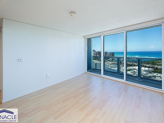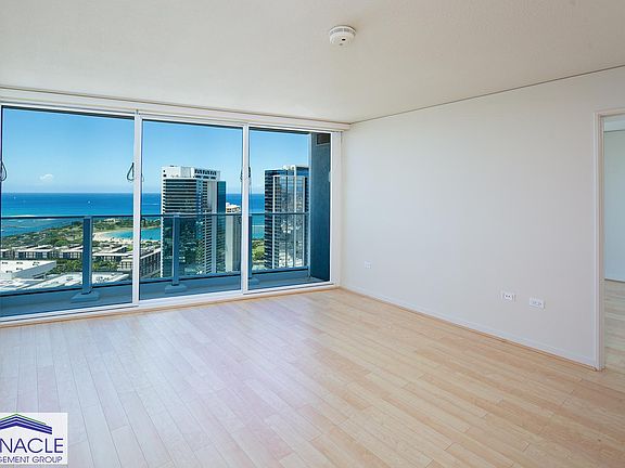 Rarely available high floor '07 unit in Moana Pacific. Luxury 2 bdr/2 bth with a den with stunning ocean and coastline views. Spacious layout with an open kitchen and huge bedrooms. 2 pkg stalls included. Secured bldg with resort-like amenities such as a pool, Jacuzzi, tennis courts, exercise room, putting green, and BBQ area. Prime location just minutes to the beach, Ala Moana shopping center, Waikiki, grocery stores, and freeway access. Pets considered. 1 year lease. Water, sewer, basic cable, and internet included. 1 small pet under 25 lbs considered.