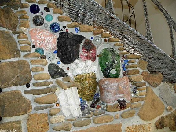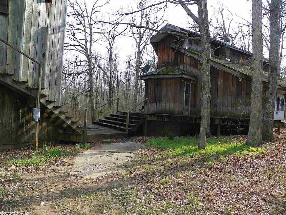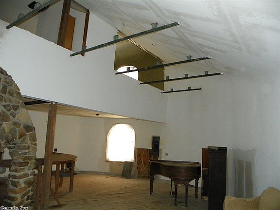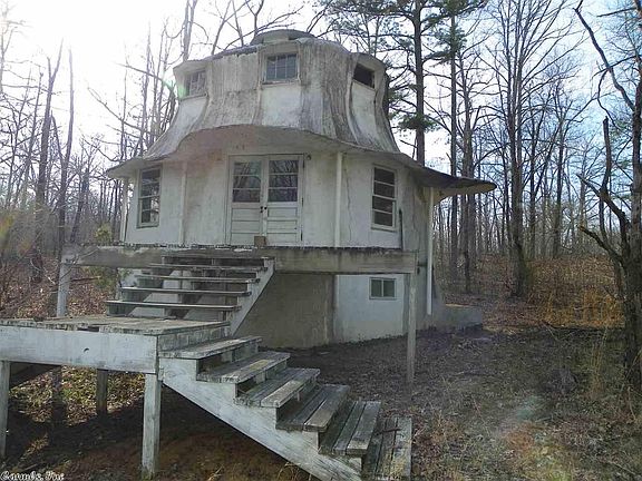 Unique unfinished 1 bedroom 1 bath home on 10 acres. This property belonged to an artist who did not get to finish it completely. The unfinished home has curved walls, a curved staircase, arched windows, large rock fireplace with conversation pit. It features an open kitchen with curved counter top and tiled walk in shower. There are two additional structures on the property one stucco two story building that was used for a kiln, the other is a three story work shop. Property is in need of some TLC.