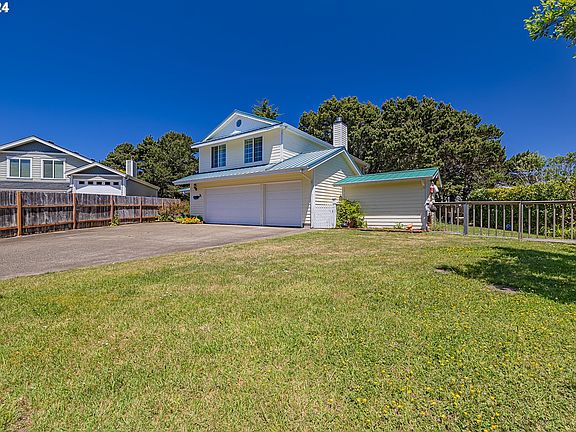 Discover coastal living at its finest in this beautifully maintained 4-bedroom, 2.5-bathroom home, bathed in natural light and less than a block from Bandon's stunning beaches. Set back on just over a quarter acre, this home is separated from the road by a stream and trees which provide natural buffers from the ocean wind. The long driveway and a 3-car garage offer ample parking, while two sheds provide additional storage. The private fenced backyard is perfect for entertaining or gardening. Inside, you'll find a bright and open kitchen with upgraded stainless-steel appliances and a pellet stove. With plenty of room to relax and entertain, this home offers the perfect blend of natural beauty, privacy, and practical amenities, making it an ideal retreat for coastal living.