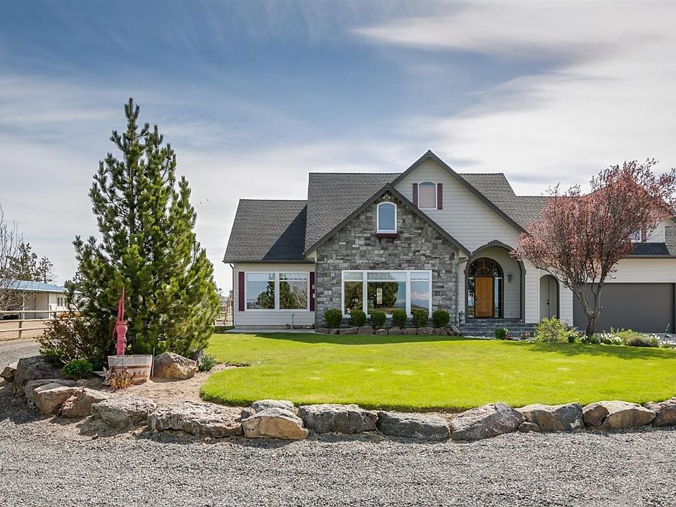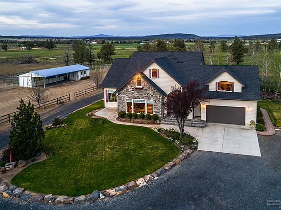Beautiful Powell Butte 3860 sq ft custom Baxter built home with 360 degree panoramic Cascade Mountain views complete with horse facility. This home offers 5 bedrooms 2.5 baths, living room with massive stone fireplace, log accents formal dining room, beautiful kitchen, large pantry, 2 mud rooms, 2 walk in closets in the master, 3 bdrms with lofts, 2 laundry rooms, lg linen closet & many extra storage areas. Large trex deck, paver walkways, beautiful landscaping, sprinkler system, fruit trees and much more. There are 20 acres with 15.5 acres irrigated with the majority in gated pipe. Hay field, pastures, FCP barn with runs, automatic water and mats beautiful knotty pine tack room, hay barn, shop, Noble panel arena, many horse pens with Noble shelters, even a set of corrals with a cattle chute. Check out this centrally located ranch.