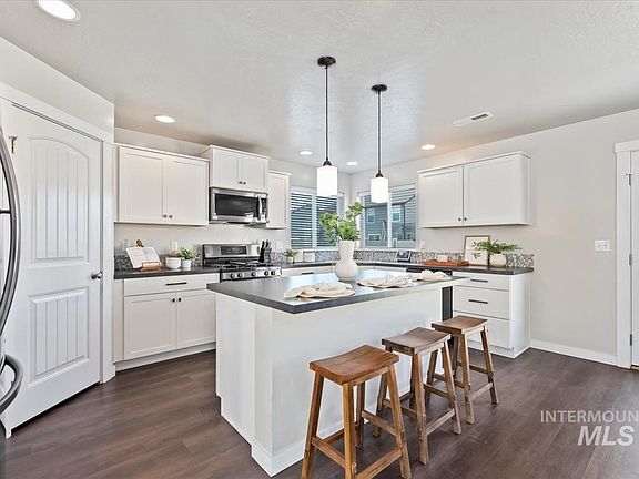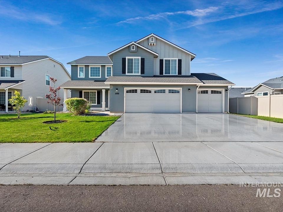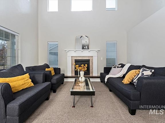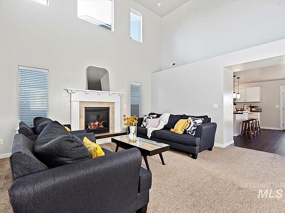 Stunning & with solar! This beautiful home will impress you every time you walk inside-- the living room is filled with natural light streaming through windows reaching to the top of the two story vaulted ceiling. The inviting room also offers a tile & wood wrapped raised hearth fireplace & beautiful stair railing. The dreamy kitchen has a sunny corner sink, soft close & upgraded cabinetry, pantry & black stainless appliances, including a Bosch dishwasher & LG refrigerator/gas range/microwave. This great floor plan offers three separate living areas--family room & living room on the main & bonus room upstairs, plus a main level bedroom that can flex as an office. The elegant & spacious master has a vaulted ceiling, large soaker tub, separate shower, dual vanities & walk in closet. The south facing back yard w/brand new sod & landscaping rock is ready for BBQing, a pool, yard games & summer fun! All within walking distance to Lakevue Elementary, 5 min to Lake Lowell & 12 min to Costco/box stores/I-84!