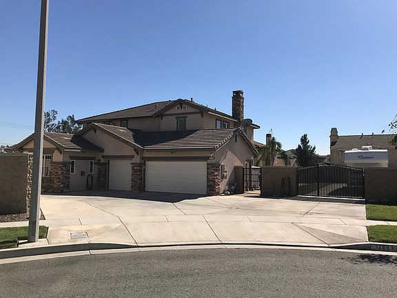 Beautifully appointed 2 story home on a cul-de-sac located on one of the largest lots in the area. First floor has upgraded tile, wood flooring and first floor bedroom. Formal living room, family room, dining room, dining area and a large kitchen. The kitchen has lovely cabinetry, contrasting granite counter tops with 2 sinks/disposals, one in the center island. Plenty of storage and a walk-in pantry along with black appliances and beverage cooler. Full home water softener and reverse osmosis water system in the kitchen. Upstairs there are 4 bedrooms and a loft area. The master bedroom fireplace is a cozy touch especially in winter. Master bathroom includes double sinks and a separate vanity, soaking tub, full-size shower and leads to the large walk-in closet. Two A/C units and whole home vent fan allow you to save energy, ceiling fans are in every room. A hard-wired security system with heat/smoke monitored sensor and security cameras installed. Motion sensor lights are located around the exterior. Outside you will find a very large lot with concrete RV parking area including full hookups and 50-amp service. Secured by 2 large iron gates, the rear yard includes 4 sheds for additional storage and a garden area that is ideal for growing vegetables. Fully fenced front yard is all grass and ready for kids or pets to play. Walking distance of Victoria Gardens. Close to local schools, parks, shopping.