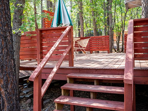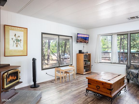 WOW.. FURNIISHED, LOCK & LEAVE.....Looking for that weekend getaway in the beautiful white mountains. Or perhaps a great VRBO property for year round rental income. Home used as vacation home only. Conveniently located only a 5 minute drive to the center of Pinetop for all restaurants and stores 30 minutes to SunRise Ski Resort. Beautiful heavily treed lot with over 25 tall ponderosa pines, NO HOA, enough parking for 4 cars PLUS RV PARKING ALLOWED. No homes directly behind you so a very quiet and private back yard. Storage shed for gardening tools or ski equipment/ fishing gear. Wood stove for those snowy getaways. Large mudroom for winter ski equipment. Fenced dog run area with doggie door access to house.COME TAKE A LOOK..... Several homes in the community are VRBO properties. Freshly painted interior, New laminate wood flooring, new plumbing, new lighting, Nice deck for outdoor dining. Don't let this one get away. Home owners are doing some last minute upgrades, EASY TO SHOW... All furniture and kitchen accessories convey at no cost. (Cuckoo clock and 4 chair patio set on deck do not convey). Note..Owners took closets out of both bedrooms to make rooms larger, plenty of space for a free standing wardrobe closet in each room.