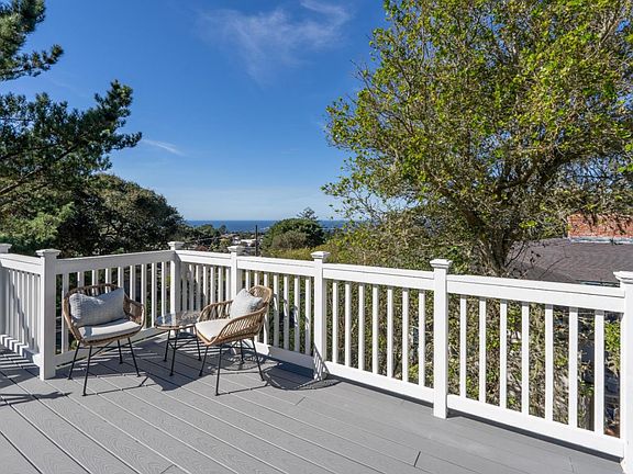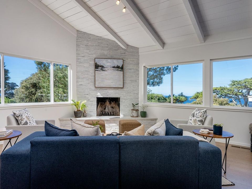 Updated three-bedroom, two-bath ranch house with ocean view in one of Pacific Groves quietest neighborhoods. Enjoy a morning cup of coffee on the deck (made with high-end composite boards) and welcome the sunrise, then switch to wine in the evening as the sun sets over the ocean. Renovated in 2019, this idyllic home features a great room with breathtaking vaulted ceilings, double-pane windows with ocean views from multiple angles, and a fireplace, all flowing seamlessly into a beautiful kitchen with an oversized island, quartz countertops and stainless-steel appliances plus an enclosed laundry room. The primary bedroom includes a spacious walk-in closet as well as an en-suite bathroom with standing shower and rainfall showerhead along with double sinks and vanity. The primary bedroom opens out onto a smaller, second deck and back patio. Includes two-car garage with built-ins. Walk to Trader Joes and nearby restaurants or take a quick drive to Asilomar for a coastal stroll.