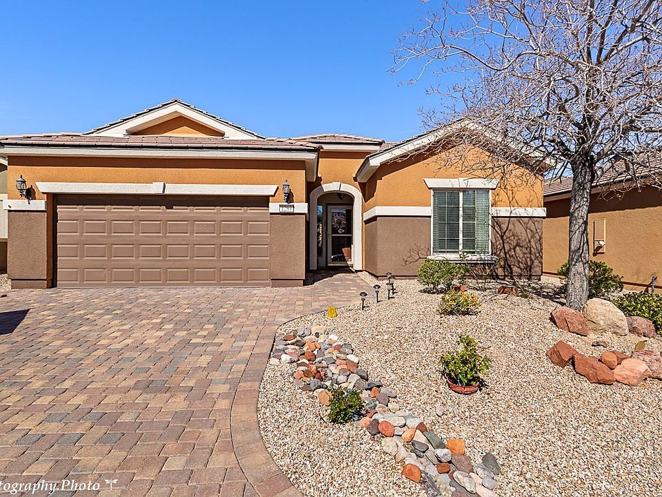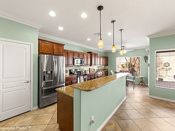 This "priced to sell" Sun City Mesquite Jasmine model is located in Saddle Horn, a highly sought after community positioned next to the Conestoga Golf Course in Del Webb's adult community. Costly pavers decorative the driveway, front walk and extended back patio. This home offers 3 bedrooms plus a den/office. Guest bedrooms are located at opposite sides of the home ensuring privacy. The open floor plan is appreciated and diagonal lay tile is extended through the living areas and den. Cool paint tones open up the space and crown molding lifts the eye. The kitchen is gorgeous... granite tops installed over a long eating bar, unique pendant lighting and upgraded Cherry Paprika cabinets w/ pull out shelving are appreciated. All stainless appliances are included & under cabinet lighting a bonus. The owner's suite is spacious and has new carpet and the ensuite hosts double sinks & large walk-in closet. The laundry room is fit with additional cabinets for storage, a laundry sink and washer & dryer are included. Enjoy the amenities that Del Webb is famous for including golf discounts at the Conestoga.