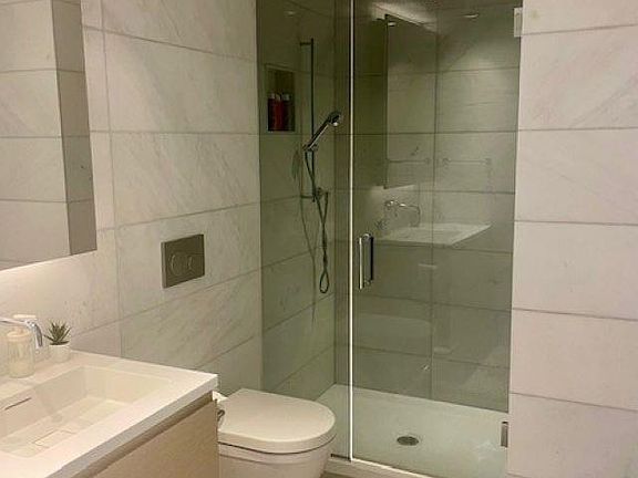 Smart efficient layoutLarge islandModern bathroomEngineered hardwood flooring