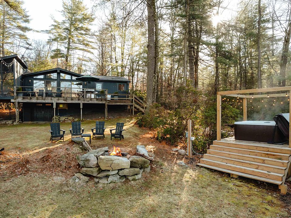 Welcome to your serene lakefront retreat, nestled among mature pine trees and a sea of mountain laurel in the charming hamlet of Forestburgh. This tastefully updated ranch-style home offers the perfect blend of comfort and tranquility, boasting various entertainment areas, including two hot tubs, a fire pit, a dock, and a safari glamping tent. Whether it's early morning water activities, mid-day picnics, or late-night stargazing by the water, this property caters to nature lovers. Inside, discover three spacious bedrooms, two full baths, and a finished basement providing ample accommodation for guests. The main living space has high ceilings, a fireplace, and sliding doors leading to a deck. Adjacent to the living room, a screened-in porch ensures you can enjoy alfresco dining while soaking in the picturesque lake views. The kitchen is a chef's dream, outfitted with top-of-the-line Bertazzoni Kitchen Appliances, elevating your culinary adventures while adding style and functionality to the heart of the home. Close to local amenities and attractions and only 20 minutes from the Port Jervis train station for easy commuting into NYC. Visit nearby quaint upstate towns like Barryville and Eldred. Explore the Mongaup Valley Wildlife Management Area that abuts the lake association with over 12,000 acres of protected lands and lakes, including the Rio Reservoir just down Plank Road. Experience the beauty of nature and the comforts of home in this idyllic lakefront retreat.
