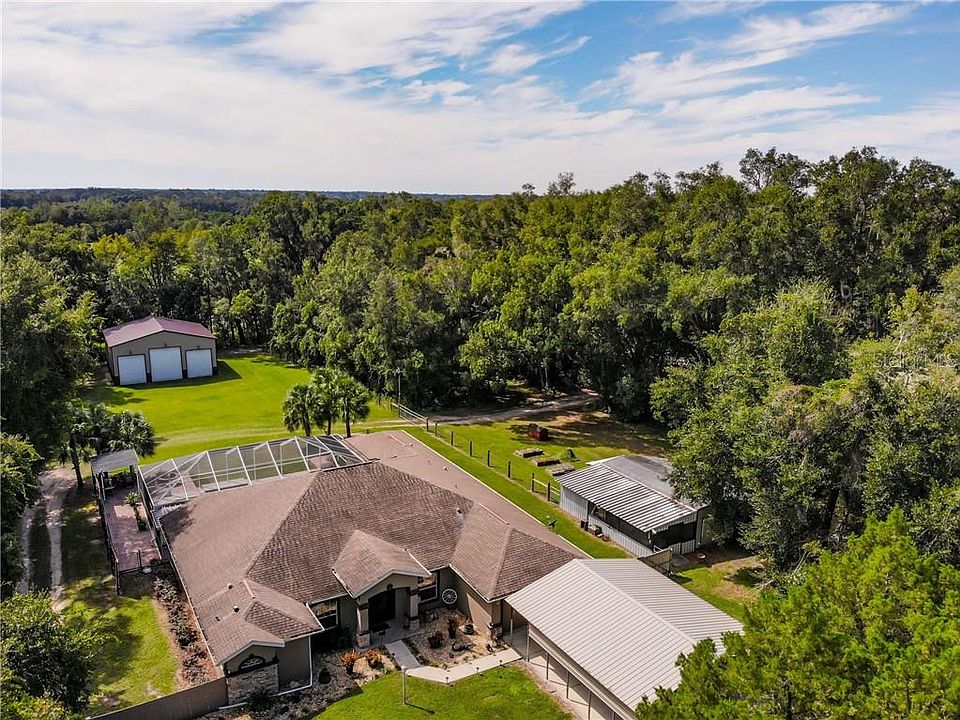 Plenty of room and privacy on this AMAZING 7.9 acre property. Beautiful 4 Bed/3 Bath/ 2 Car Garage + Office, Pool, 40x40 Workshop, Guest House, Outbuildings, Pole Barns and Cook Shed (with its own Kitchen and Office). This property has it all. The Main House: Boast large kitchen w/ plenty of storage; loads of living space, vaulted ceilings and natural light in great rooms; split plan; enormous master suite with separate seating area; indoor laundry; fantastic lanai overlooking screened pool area plus additional outdoor space with fire pit, perfect for relaxing or entertaining. Main house is fenced with entrance through electric security gate and includes a Huge 40x40 Metal building with 3 roll up doors to accommodate vehicles, boats or RV. Guest cottage built in 1928 is 2/1 with new metal roof, new well, new windows and freshly painted interior/exterior. Separate Fenced area with 72 x 24 Pole barn, 40x60 (w/additional 24' lean-to) Pole Barn, and 24x36 Pole barn. All of this nestled in NE Marion county with easy commute to Ocala or Gainesville. Come make this your home today. (This property is comprised of more than one county parcel number).