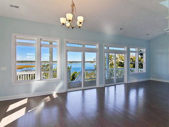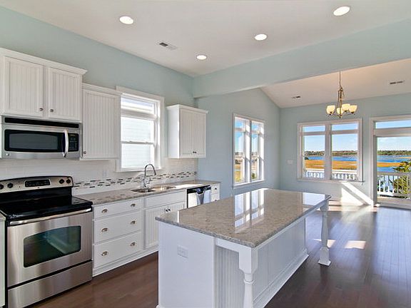New Soundfront home in Surf City features beautiful finish details and breathtaking water views. Interior features include gleaming wood floors, vaulted ceilings, and walls of windows that bring the blue waters of the Topsail Sound. Enjoy peaceful serenity from this quiet wooded lot at the end of a private road. Enjoy the morning breezes or spectacular sunsets from the covered sound front decks. Beautiful kitchen with granite, custom cabinetry and stainless appliances. The home boasts 5 bedrooms and a loft with 180 degree views. Enjoy the sound or the beach, just a short walk away from this luxurious new home.