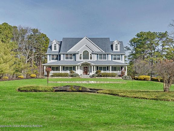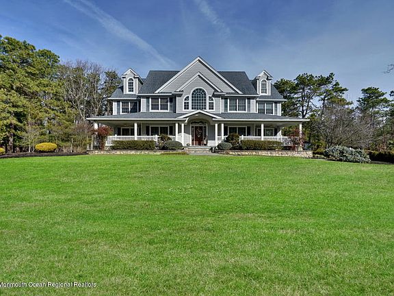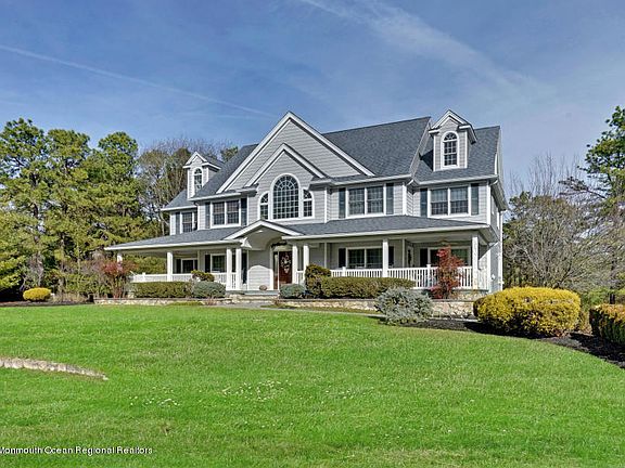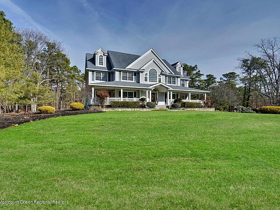 Have the best of both worlds in desirable Monmouth County. Only minutes away from everything awaits your sanctuary on this sprawling custom built estate. Perched on two acres of secluded professionally landscaped property this home is truly one of a kind. Enjoy your morning coffee on the oversized covered porch and then have a relaxing dinner on the back deck in the evening. This home provides tranquil views from every angle. Custom architectural details are evident as you enter into the two story open foyer leading to the open family room and beautiful kitchen. The see through gas fireplace framed from floor to ceiling in gorgeous stone can be enjoyed from the family room as well as the kitchen. The kitchen boasts stainless steel appliances including Sub Zero refrigerator, Viking beverage center and walk in pantry. Each of the second floor bedrooms contain a full bathroom, walk in custom closet as well as linen closet. Star gaze out the huge picture window as you enjoy the warmth of the fireplace in the master bedroom. Master has 2 walk in closets that lead into the private bath with Jacuzzi tub and oversized shower with an unbelievable 14 body sprays. First floor and walk out basement have radiant heat which provides unsurpassed comfortable warmth. Radiant along with individual room temperature control makes the heating system very cost efficient. Wood floors throughout, central vacuum system, surround sound entertainment system in every room, sprinkler system, home alarm system with exterior cameras, basketball court and tons of parking space all add to the magnificence of this home which has to be seen to be truly appreciated, don’t miss out on this one.