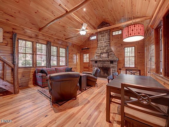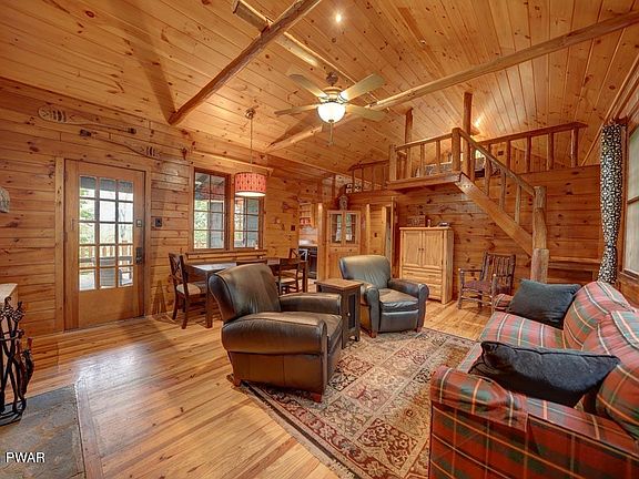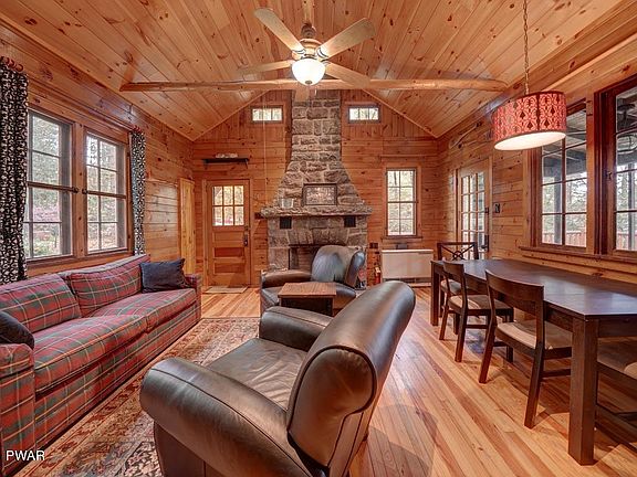 You can not miss this completely adorable lakeview cabin at Lake Wallenpaupack. The many features include: 2nd tier, 2 bdrms & 1 custom full bath, very spacious loft and dock slip on Wallenpaupack. Privated wooded, sloped lot with large side & back deck, circular driveway, awesome open fireplace for those summer nights around the pit. A very short ride to the lake & docks. This is what a quintessential country lake cabin really looks like! Hardwood floors and beautiful knotty pine ceilings w/ American chestnut walls throughout. Updated kitchen! This is the all-year round lake sanctuary you've been dreaming of!
