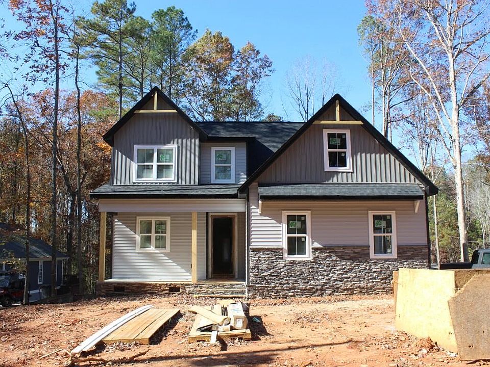 MOVE-IN READY at Lake Royale! Enjoy resort-style living with a private 345-acre lake, beaches, clubhouse, pool, tennis, pickleball, boating, fishing, and more. Custom-built by Ken Harvey Homes, this thoughtfully designed home features a First-Floor Primary Suite and a spacious rocking-chair front porch. Wide plank engineered hardwoods flow through the main living areas. The gourmet kitchen showcases Stone Gray painted cabinetry, Morning Frost granite, picket-style tile backsplash, stainless steel appliances, walk-in pantry, designer island lighting, recessed lighting, and a single bowl stainless sink with window view. The Family Room features a slate surround gas fireplace and French door leading to the covered rear porch. The Primary Suite offers a trey ceiling, crown molding, a walk-in closet, and a spa-inspired bath with tile flooring, quartz dual vanity, and a tiled walk-in shower with niche. Upstairs includes a Bonus Room plus two secondary bedrooms, both with walk-in closets. Mudroom drop zone off the side-entry 2-car garage.