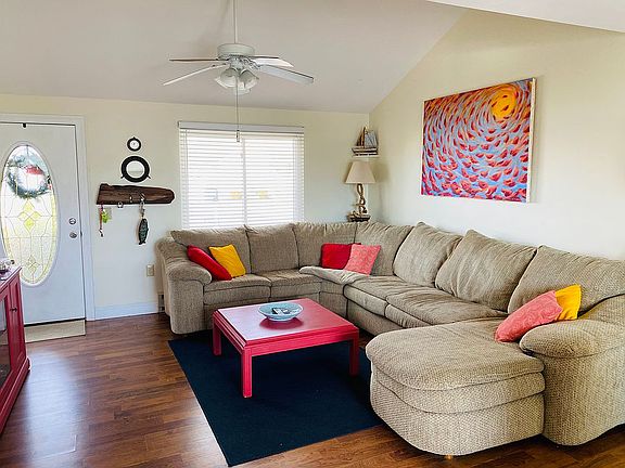 The beach house that you will make memories in for years to come! 3 bed, 1 full bath, living space is 960 square feet plus 12’ x 16’ three season sunroom with gorgeous natural light. Enter in the front door to a beautiful open plan living area, perfect for entertaining. The large tv area flows into the kitchen with breakfast island that fits 4 people easily. The kitchen is fully equipped and washer/dryer area is in the bathroom. Crawlspace has been professionally covered with plastic. There is ample area to dock your boat in the backyard lagoon. Take a sun drenched shower outside in the enclosed, open top outdoor shower.