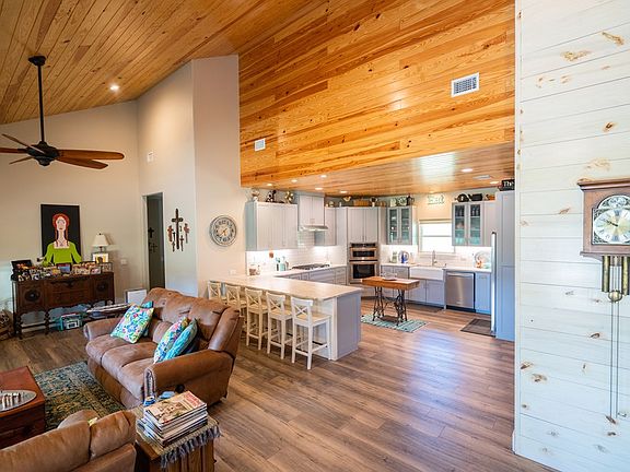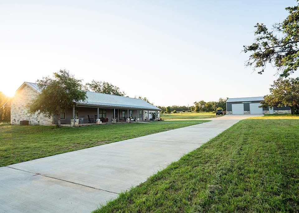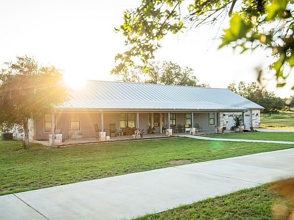 Spectacular ag exempt property on 5 acres in The Bluffs at Round Mountain. As you drive in, you will be greeted by the expansive front porch that runs the entire length of the home. Once inside, the vaulted ceilings will amaze you in this open concept great room, first class kitchen, and dining space. The bedrooms are on a split plan and all have oversized closets. The primary suite includes vaulted ceilings, walk-in closet, and master bath that is exquisite with double vanities, quartz countertops, and walk-in shower. Also included is a 60' X 40' shop with a half bath and porch/fire pit area.