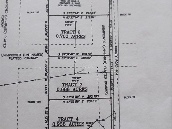 Currently platted into four lots: three approximately 0.87 acres each, and one at 1.25 acre located near the intersection. This offers multiple options for resale, investment, or building. There is also the possibility of acquiring an additional 2 acres within the next year.