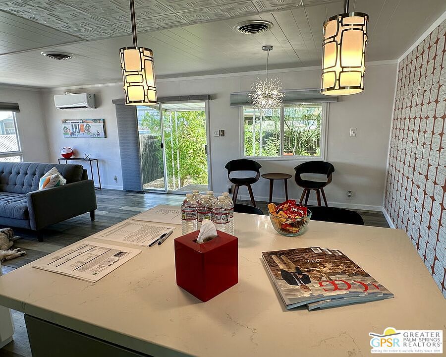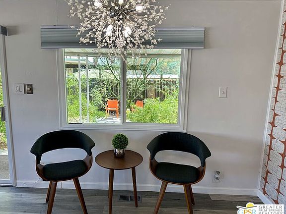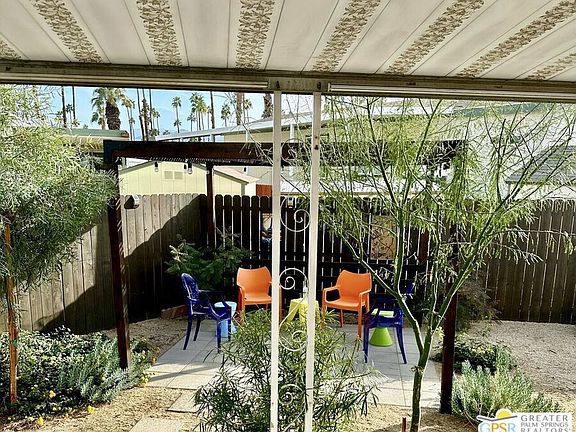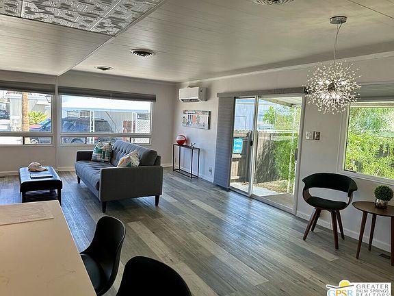 Welcome to this beautifully updated 2 bed 2 bath mobile home offering 960 sq ft of comfortable living space in a prime location close to shops, dining and amenities. This Mid-Mod vibed home, with new lighting fixtures and flooring throughout, boasts a bright open floor plan that effortlessly connects the kitchen, dining and living areas, perfect for everyday living. The primary bedroom features an en-suite bathroom which has been remodeled incorporating a mid-century atmosphere. While the second bedroom, also ideal for a home office, enjoys direct access to the also updated hall bath, creating a flexible layout. The open kitchen shines with new Samsung appliances, quartz countertops and a rolling kitchen island that flows into the dining and living areas for a modern airy feel. Both bedrooms and living room are equipped with efficient money-saving mini-split systems for personalized comfort. The welcoming backyard with a full-length awning covered patio, free standing wooden pergola and soft side hot-tub is perfect for unwinding and for your four-legged family members to play in a secure wooden fenced environment with an outdoor drip system to irrigate the surrounding low maintenance desert landscaping. Other features of this home include a covered carport, offering ease of parking along with additional shade, 2 storage units, landscape lighting, recoated roof, new paint both inside and out, textured wallpaper, an in-unit stacked washer and dryer, electronic fireplace and a tankless water heater. The well-maintained and automated gated entrance to the Royal Palms, a mobile home active 55+ community stands above all others in its amenities such as pickleball courts, pool, spa, putting golf, shuffleboard, large clubhouse with upstairs gym, pool tables, barbeque areas and so much more. This move-in ready mobile home blends functionality, comfort and location into one incredible package. Don't miss this one.