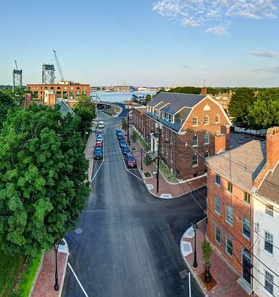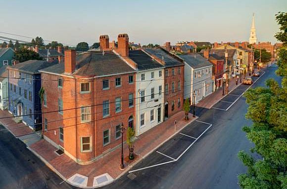 In-town and wonderful, unique 3 story brick house on a picturesque corner, one block from the river and Market Square! Stunning and stylish interior combines contemporary and 19th c. charm with a gallery-like atrium, custom kitchen with marble tile counters, many cupboards, granite martini/coffee bar and glass blocks for artistic accent. Down one level is a media room, craft or exercise room; up one story the house returns to its colonial roots and is reminiscent of a Beacon Hill abode with a lovely, fireplaced living room, wide pine floors, guest room and bath including laundry. Master bedroom with full bath and skylight has small river views, a sitting area, custom built dressing room plus walk-in closet and is its own fabulous, charming, private suite on the 3rd floor! One car gated parking on site. Central Business Zone.